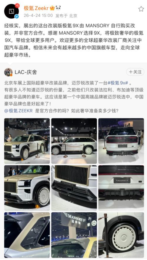 “展出的这台改装版极氪9X由MANSORY自行购买并改装,并非官方合作。”